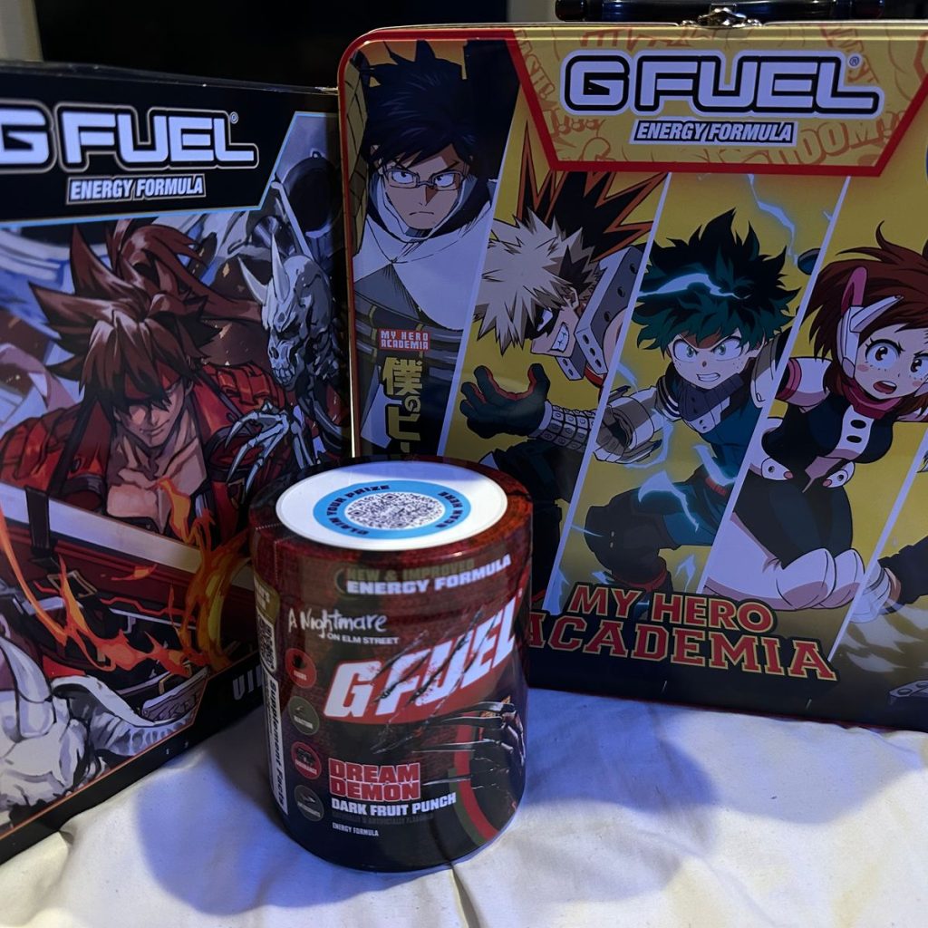 جي فيول جيلتي جير سترايف بوكس نسخة المجمعين علبتين بنكهة توت الاساي والعلبة الاخرة بنكهة التوت الازرق- 40 حصة استعمال مع شيكر شعار جيلتي جير بسعة 709مل – G fuel Guilty Gear Strive Collector’s Box 40 servings tube.