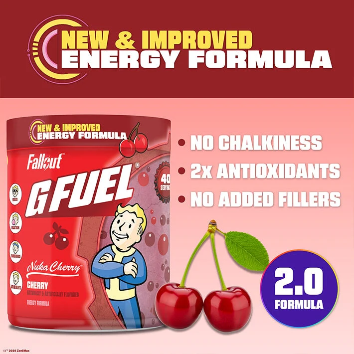تم تصنيع Nuka Cherry بالصيغة الجديدة والمحسّنة 2.0، ويأتي مع 40 حصة مضمونة لكل عبوة خالية من الإشعاع، بالإضافة إلى مضادات الأكسدة المعززة للطاقة، ومكونات تدعم التركيز، وعناصر تساعد على التحمل — كل ما يحتاجه العقل والجسم للبقاء في عالم ما بعد الحرب النووية!